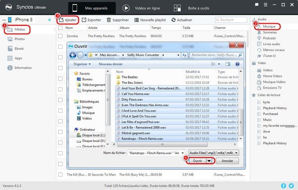 tout d'abord, il faut télécharger Syncios iPhone Transfer dans son site officiel:https://www.syncios.fr/features.html. iTunes s'ouvra au momant du démarrage de Syncios >> Connecter votre iPhone 8 avec un câble d'USB au PC >> Syncios iPhone 8 Tranfer analyse et identifie automatiquement votre iPhone 8. Après avoir connecté votre iPhone 8, on verra l'interface de Syncios iPhone Transfer, cliquez sur Médias à gauche, Musiques à droite et puis Ajouter au centre, on peut aller au dossier historique de Spotify Music Converter en ajoutant les morceaux convertis dedans. Choisissez les chansons que vous voulez écouter dans votre iPhone 8, et puis cliquez sur Ouvrir.